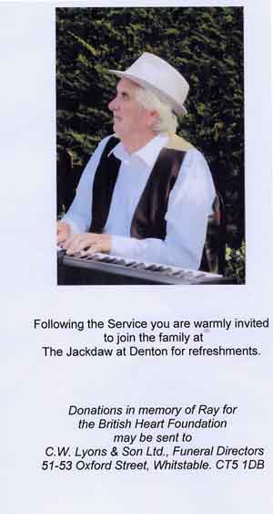 Sadly Ray passed away 1st January 2019 at a grand age of 86 and playing to the end here is Ray playing at 'The Swingate Inn' on 30th May 2002 with Lyn Falvey Touch of Class click here to listen to the talent of Ray singing and playing 'Just Around the Corner'