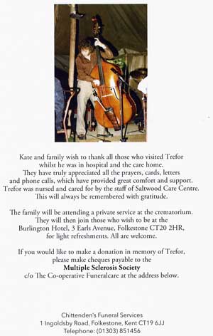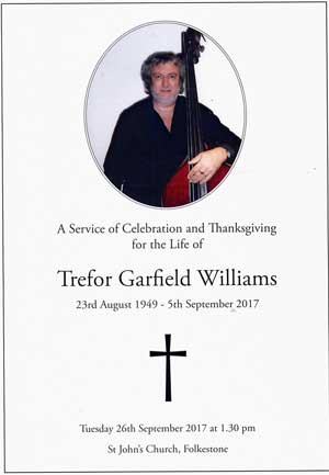 ![]() Trefor Williams - Double Bass Here is Trefor playing 'Baby Face' with the Phil Mason's New Orleans Allstars recorded 27th February 2007. Band personnel: Phil Mason cornet, Roger Myerscough clarinet, Micky Cooke trombone, Jim Mc Intosh banjo, Laurie Chescoe drums and yours truly, with a great vocal and a fine solo - Trefor double bass. This track is on their latest CD, 'Cotton Fields back Home', due to come out in the late summer - to get your copy contact Phil Mason on +44 (0) 1700 500635 I fell in love with the bass at the age of three. Every Sunday afternoon, in the early fifties, my parents used to take me to visit my Grandparents. My Grandfather had a beautiful polished wood radiogram in the lounge and he would play records from his collection of orchestral music and I would stand in front and conduct. It was the bass frequencies that vibrated through the floor and up into my little body that excited me, and later, when I had my own record-player, I would have the tone controls on "full bass". It was inevitable that I would eventually get my hands on a bass, after hearing the muses of Charles Mingus and Richard Davis.Originally I was an Essex lad, studied double bass with one of London's top session musicians and, subsequently, have worked with many top-line artists, from "Kid" Thomas Valentine, "Wild" Bill Davison and Sammy Rimmington to the "Midnite Follies Orchestra", the "Inkspots" and Eartha Kitt. I was a founder member of "Phil Mason's New Orleans Allstars" from 1992, worked for more than twenty-one years with the "Max Collie Rhythm Aces",and I have toured all over Europe, Scandinavia, the USA, Canada, Japan, the cities and outback of Australia and even the Jungles of Borneo. I continue to gain strength, direction and purpose from my deep Christian faith, my wonderful wife, Kate, and the fellowship and constant challenges I get from all the fine musicians I have the pleasure to work with.--------------------------Onwards and upwards God bless you Bassically yours Trefor Williams. Sadly Trevor has passed away on the 5th September 2017